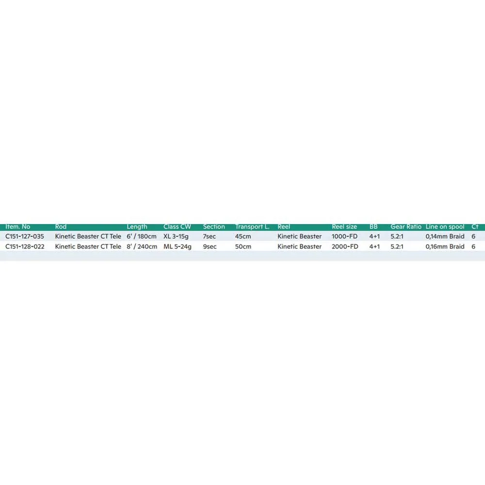 Stow, go, and be ready for every fishing opportunity with the Kinetic Beaster CT Tele rod and reel setup. This well-matched travel combo includes a telescoping fast-action rod. It collapses down to less than xx cm for easy storage, but extends out to full size to give you a strong, sensitive rod for all-around fishing. Fitted with stainless steel guides for maximum strength, this rod has a split-grip handle design with graphite reel seat and comfortable EVA grips. The matching spinning reel features a sturdy graphite frame, sideplate, and rotor supporting its aluminum spool and bail wire. Built tough inside with a zinc main gear, hard-brass pinion gear, and smooth 3+1 bearing system that includes PowerLock™ instant anti-reverse. Felt drag washers. Diecast aluminum handle.