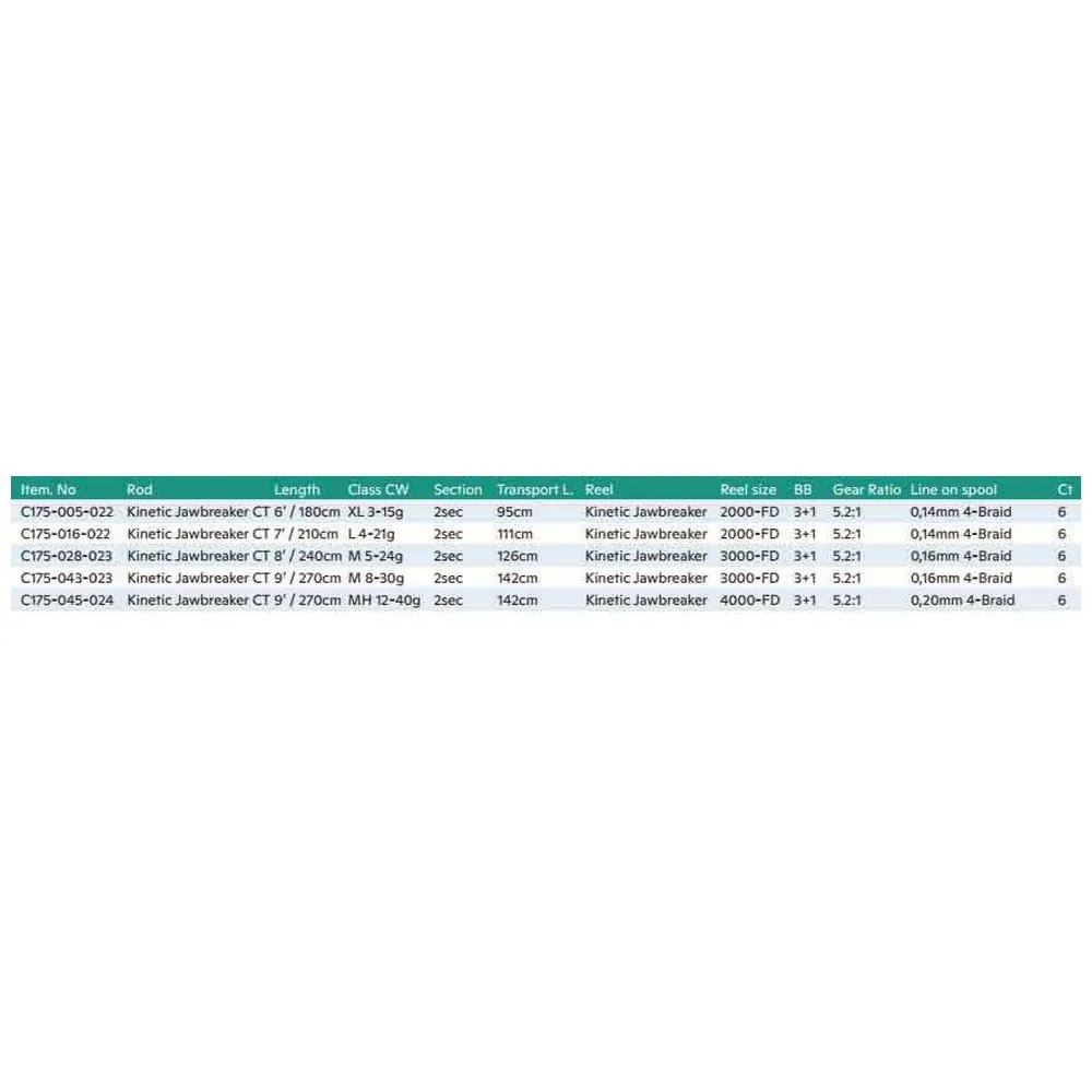 Smooth performance at a great value! Jawbreaker CT spinning combo delivers tourney-class rod-and-reel performance, every day. Our Jawbreaker spinning reel features a lightweight graphite frame and side plates, and is fortified with a machined, double-anodized aluminum spool and corrosion-resistant stainless steel main shaft. The premium 3+1 system incorporates 3 stainless steel ball bearings, plus one instant anti-reverse bearing. The matching Jawbreaker spinning rod is crafted using our exclusive CarbonTech graphite which offers great casting performance. With minimal weight and enhanced sensitivity, this rod is perfect for long days on the water. Ultra-light single high frame guides, ergonomic screw-down graphite reel seat, cork and EVA split-grip handles for outstanding balance and comfort in all conditions.